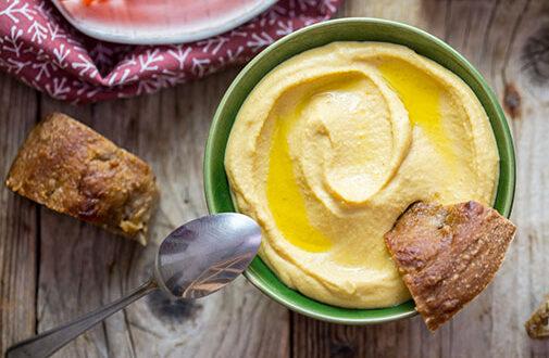 Hummus di lenticchie al curry e mango: il retrogusto dolce del mango ben si sposa con le note piccanti del curry .