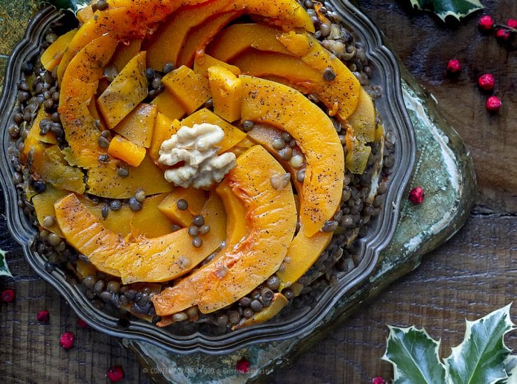 Sformato di lenticchie con zucca, mela cotogna, prugne, robiola e noci: ricca ma anche piuttosto leggera questa proposta per la tavola di Capodanno