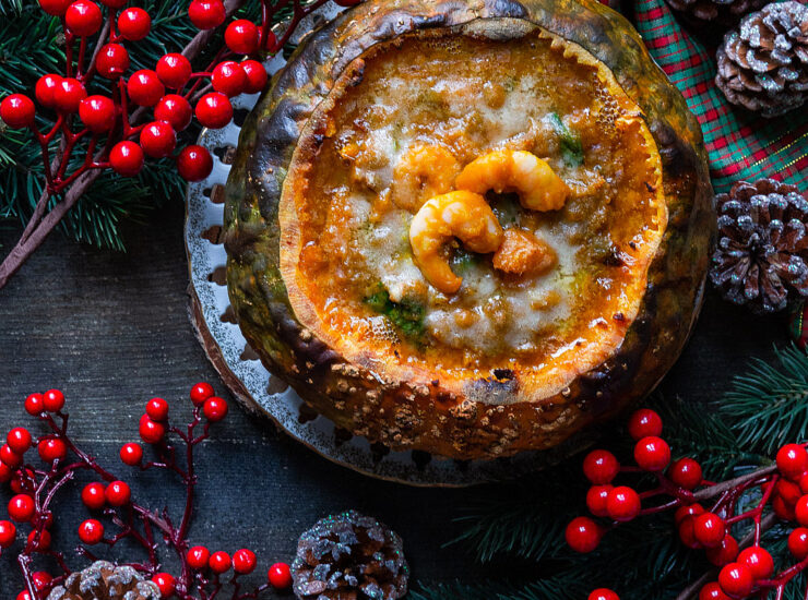 1 zucca dalle dimensioni desiderate (consiglio la Delica)., 500 g di zucca pulita, 250 g lenticchie secche (senza bisogno di ammollo per velocizzare i tempi), 16 gamberi (si possono anche usare i gamberetti precotti e metterne di più) o ingrediente altrimenti gradito, spinacini baby (solitamente confezionati che si comprano per mangiare crudi in insalata) o cavolo nero, (altrettanto interessante e che si sposa molto bene con gli altri ingredienti) q.b.