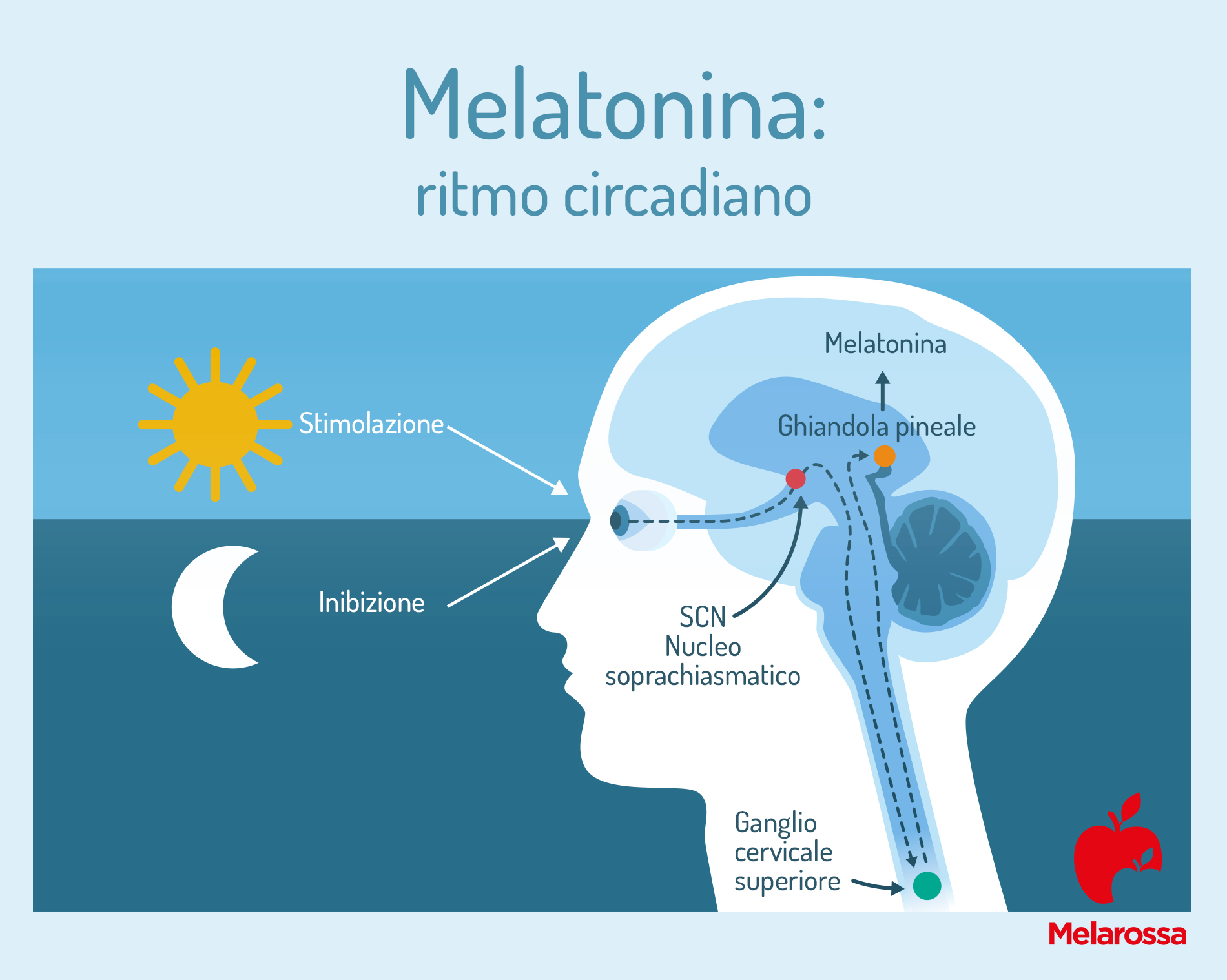 Lamelatonina è un ormone prodotto dalla ghiandola pineale, posta all’interno della scatola cranica, e il suo rilascio è regolato dalla luce. Durante il giorno, l’esposizione alla luce inibisce la produzione di melatonina tramite un segnale trasmesso dalla retina alla ghiandola pineale. Al contrario, di notte, la produzione di melatonina aumenta significativamente.
